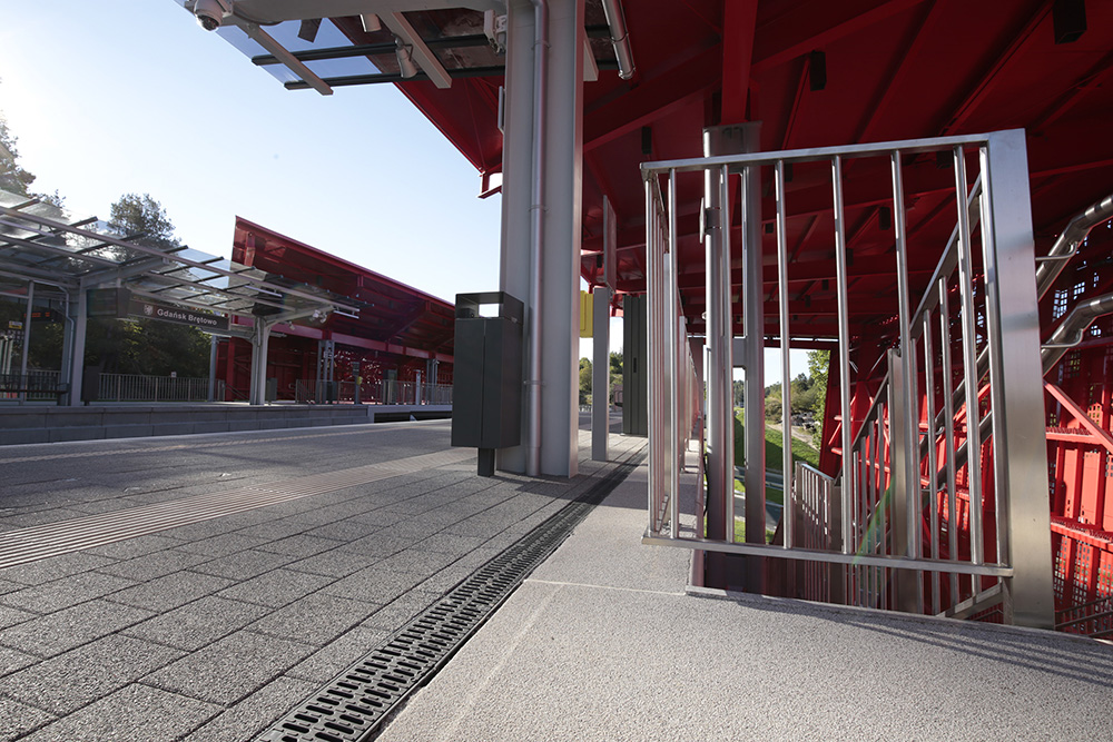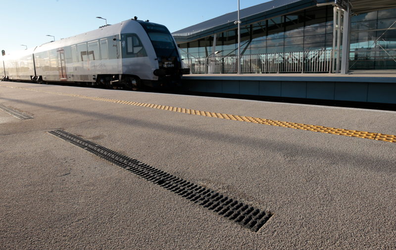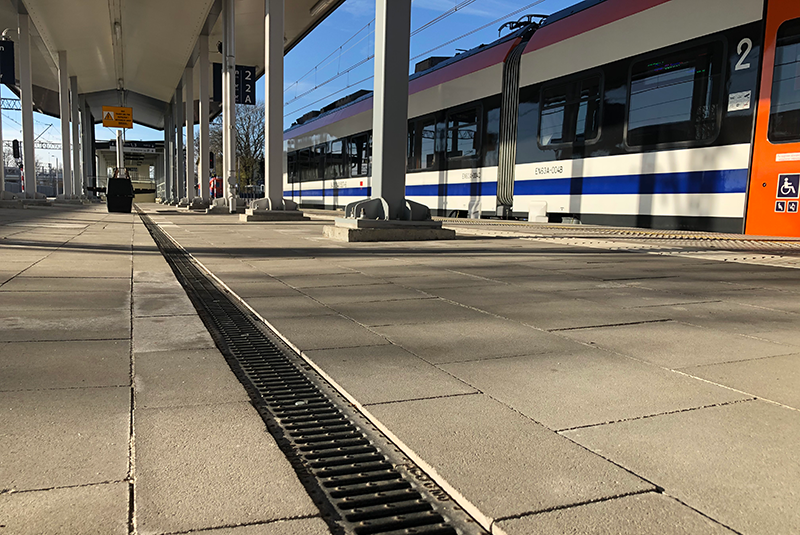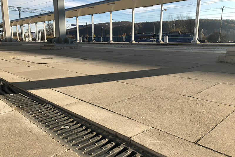 Monolityczne odwodnienie stosowane na peronach, oraz przejściach podziemnych gwarantuje bezpieczeństwo użytkowania poprzez niedemontowalny ruszt. Monolityczna konstrukcja nie pozwala na demontaż rusztu dzięki czemu nie występuje niebezpieczeństwo kradzieży lub wykorzystania rusztu jako niebezpiecznego narzędzia. Wąskie szczeliny rusztu dopasowane są do ruchu pieszego, a nawet obuwia użytkowników (w tym obcasów). Monolityczne rozwiązanie można dopasować do nawierzchni dzięki możliwości produkcji w różnych kolorach szarym, naturalnym, antracytowym. Czyszczenie można wykonywać za pomocą łatwo dostępnych narzędzi wykorzystywanych do innych zadań przy utrzymaniu infrastruktury peronów i dworców (myjka ciśnieniowa).